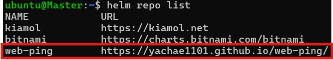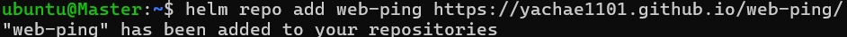 helm repo add {REPO_NAME} https://{USER_NAME}.github.io/{REPO_NAME}/helm repo add web-ping https://yachae1101.github.io/web-ping/
