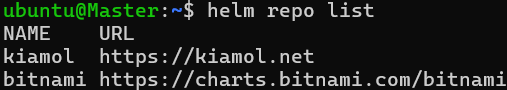 helm repo add 이름 URLhelm repo add kiamol https://kiamol.nethelm repo add bitnami https://charts.bitnami.com/bitnamihelm repo remove 이름helm repo list