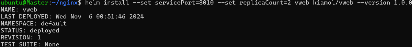 helm install --set servicePort=8010 --set replicaCount=2 vweb kiamol/vweb --version 1.0.0