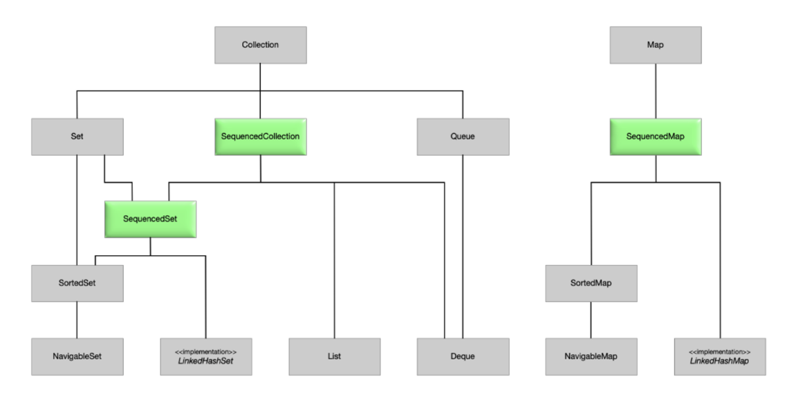 기존 컬렉션 계층에 추가된 sequenced collections, sequenced sets, sequenced maps를 위한 새로운 인터페이스