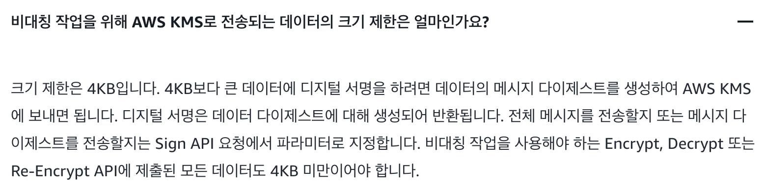 AWS KMS FAQ에 따르면, 비대칭 키를 사용한 직접 암호화 작업은 최대 4KB의 데이터만 처리할 수 있었다.