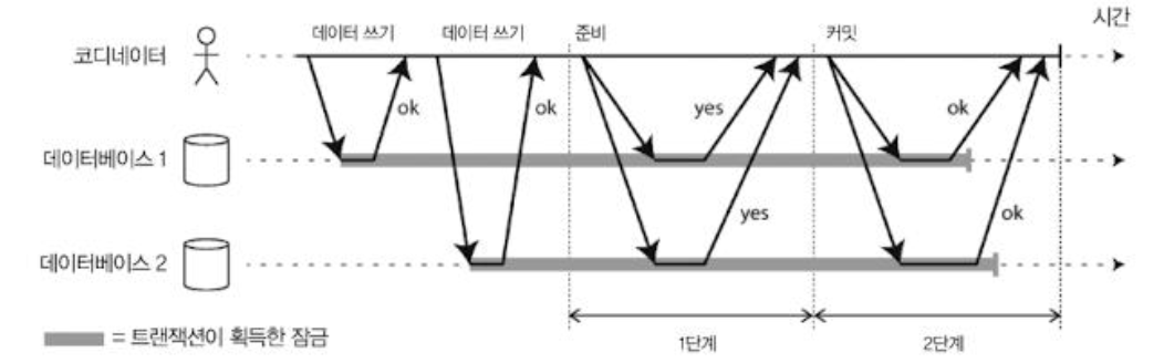 2PC는 단일 노드 Transaction에 존재하지 않는 coordinator(트랜잭션 관리자)라는 컴포넌트를 사용한다.