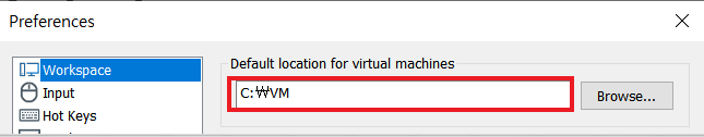 Edit → Preferences → Default location for virtual machines에 Browse를 클릭하고 경로를 c:\VM으로 설정해준다.