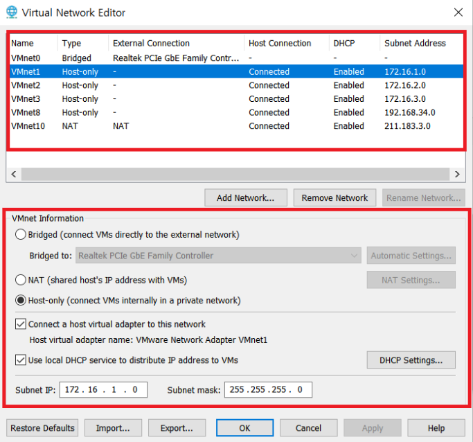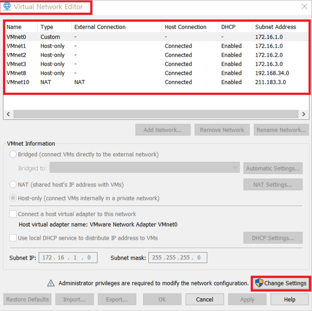 Edit → Virturl Network Editor →change settings을 클릭하고 VMnet0,1,2,3,8,10을 생성한다.