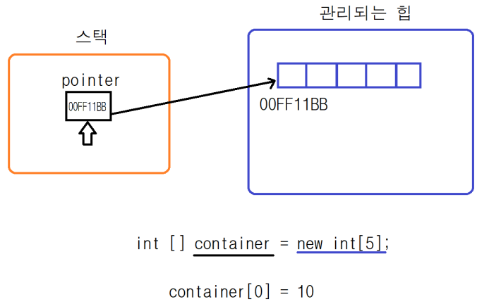 사진상의 container라는 이름을 가진 배열은 배열이 저장된 주소를 가리킴