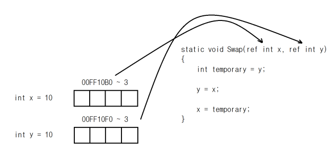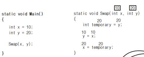 쉽게 말하자면, 메인함수에 있는 x와 y값이 참조 형태 인자로 매개변수로 전달되기 때문에, 안에서 값이 바뀌면 밖에서도 바뀐 값이 적용된다