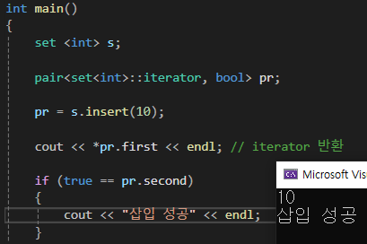 set :: insert()는 실제로 삽입된 위치(반복자) & 삽입 성공 여부(bool)을 반환함.