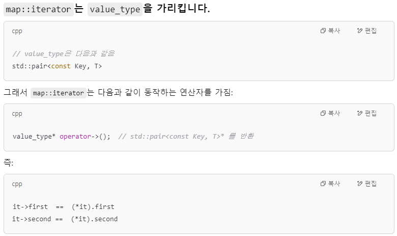 map의 반복자 iterator가 operator -> 를 오버로딩 한 상태이기에 사용 가능