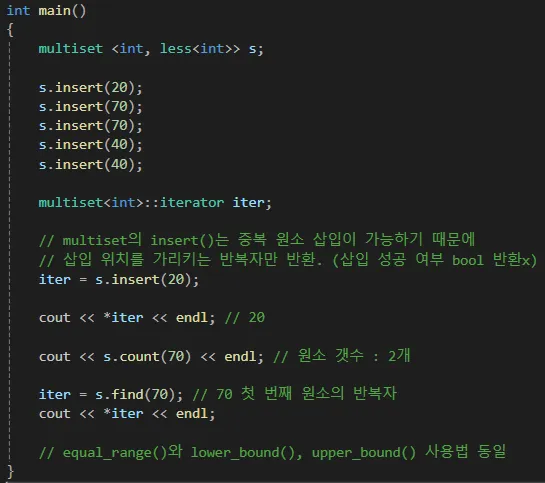 아래는 multiset의 몇가지 멤버 함수