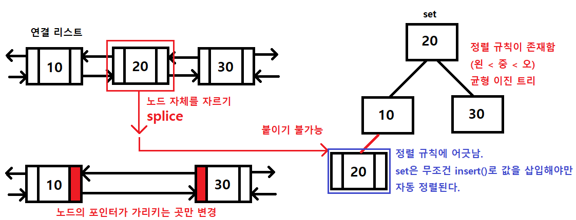 ➡ 리스트의 splice는 노드 자체를 포인터로 잘라서 붙이는 것. set는 본인만의 정렬 규칙이 존재하기 때문에 (균형 이진 트리) 잘라와서 붙일 수 없고, 무조건 insert()로 정렬 삽입 해야한다.