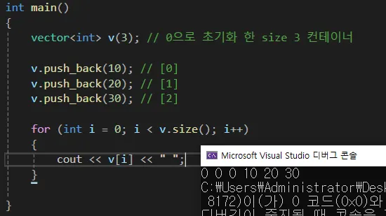 โก ์๋์ ์ฝ๋์์ 0์ผ๋ก ์ด๊ธฐํํ 3๊ฐ์ ๋ฐ์ดํฐ์ push_back()์ผ๋ก ๋ฃ์ ๋ฐ์ดํฐ๋ ๋ณ๊ฐ!!