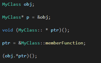 void (MyClass:: * ptr)();ptr = &MyClass::memberFunction;-> ptr은 MyClass 클래스의void memberFunction()을 가리킬 수 있는 포인터