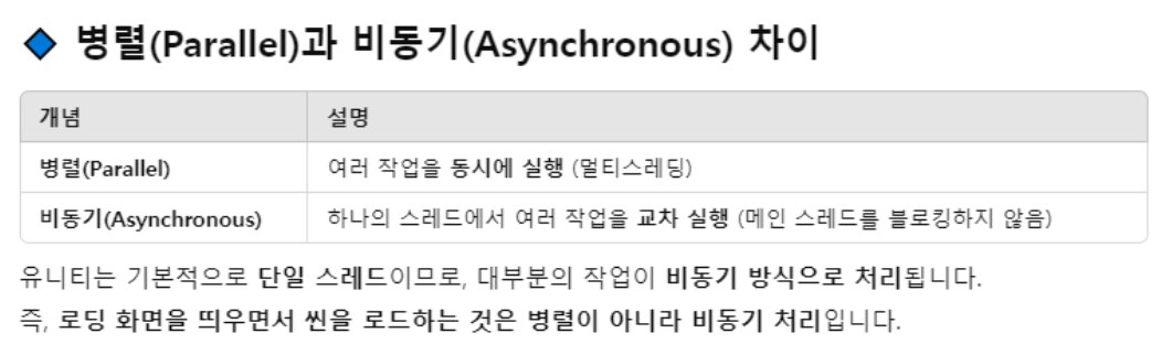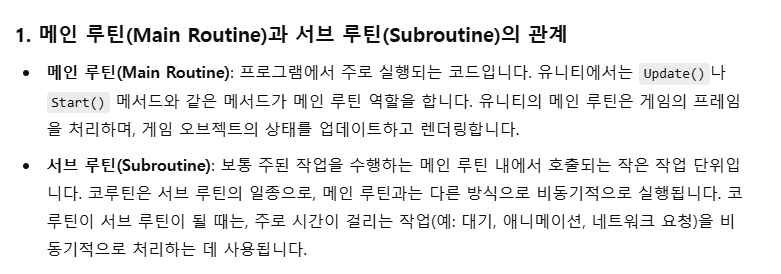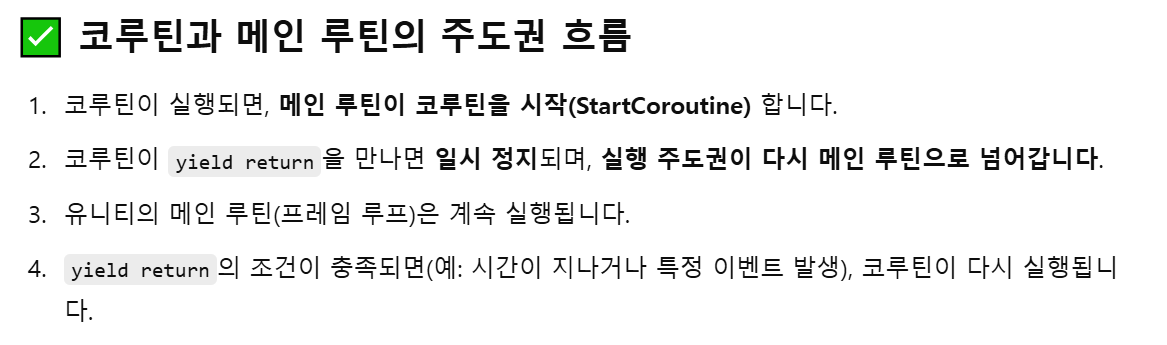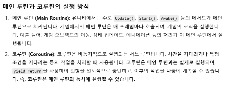 코루틴은 유니티의 메인 루틴에 의해 호출되며, 코루틴이 실행되는 동안 메인 루틴은 계속 다른 작업을 처리할 수 있다 (비동기적)
