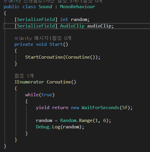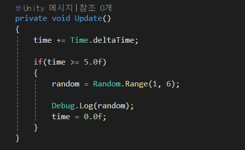 5초마다 랜덤한 숫자를 Debug로 찍어보기 위해 Update함수에서 연산 식을 짜보았다