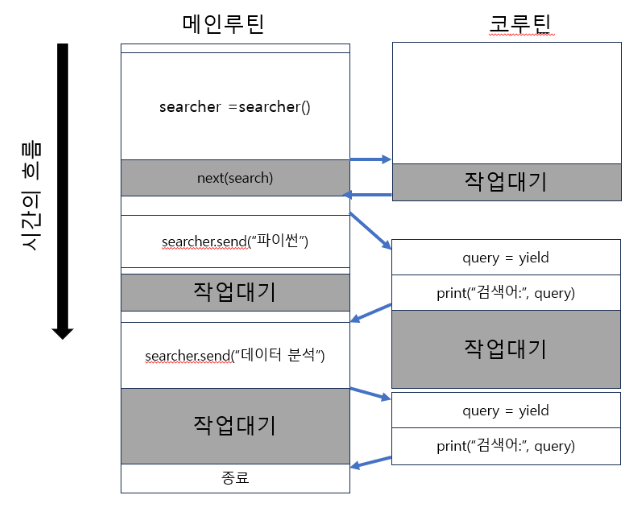 -> 코루틴이 별도의 스레드에서 실행되는 것이 아님!! 메인루틴 돌 고 있을때 비동기적으로 실행되는 것이고, 메인 루틴과 병렬로 실행되는 것이 아니라!!! 잠시 정지되었다가 다시 실행되는 느낌
