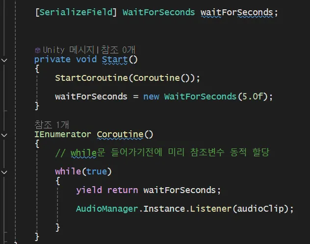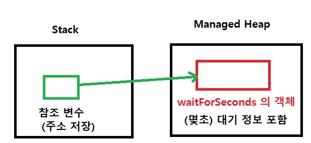 WaitForSeconds 타입의 참조변수를 생성하고, new로 동적할당→ waitForSeconds 를 재사용할 수 있다