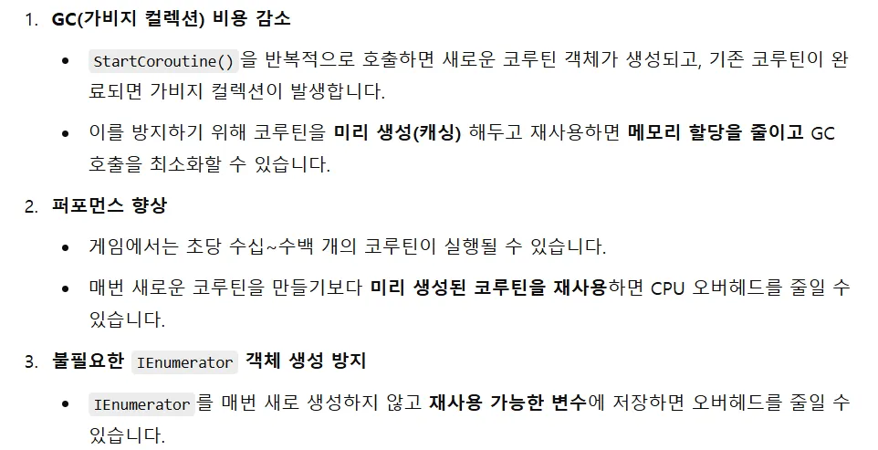 → 최적화 하지 않으면 GC비용이 증가한다 (반복적으로 StartCoroutine()이 호출되거나 WaitForSeconds가 new로 할당될때 여러개의 객체가 생성될 수 있다)