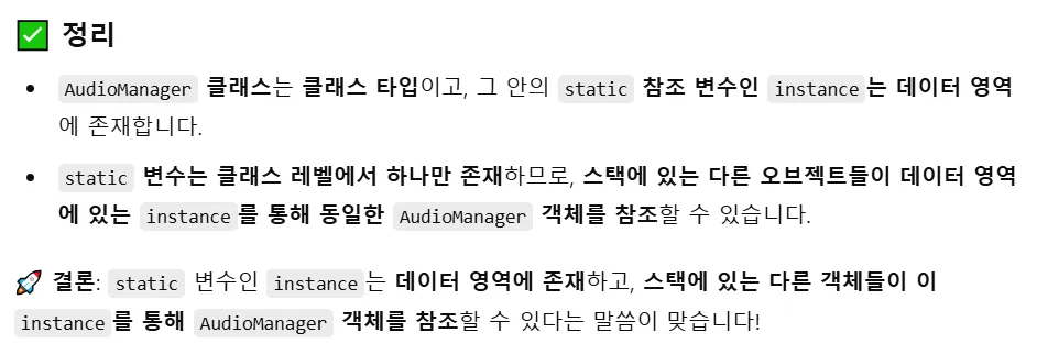 AudioManager 클래스 타입으로 생성된 참조변수 instance는 전역으로 생성되었기 때문에, 메모리의 DATA영역에 생성된다