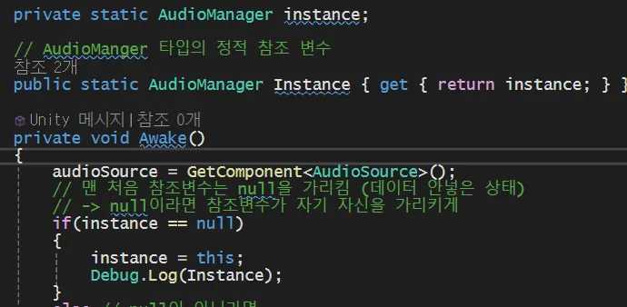 Singleton.Instance로 접근 가능DontDestroyOnLoad() 사용)AudioManager 타입의 참조변수 instance를 static으로 생성한다→ 전역으로 생성하였기 때문에, 이 클래스를 모든 곳에서 사용할 수 있다 (공유)