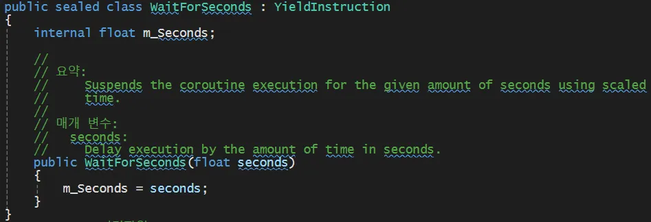 YieldInstruction을 최적화 해야한다yield 구문 자체는 가비지 값을 생성하지 않지만, new가 붙는 것들은 가비지가 생성되기 때문에 캐싱해주는 것이 좋다WaitForSeconds 의 원형을 보면, 클래스 타입으로 YieldInstruction 을 상속받고 있다 (return Yield 타입들)new WaitForSeconds를 호출할때마다 새로운 객체가 생성된다→ while문을 돌려서 자주 호출하면 GC부하 증가 (유니티는 자동으로 GC가 메모리를 정리하긴 함)