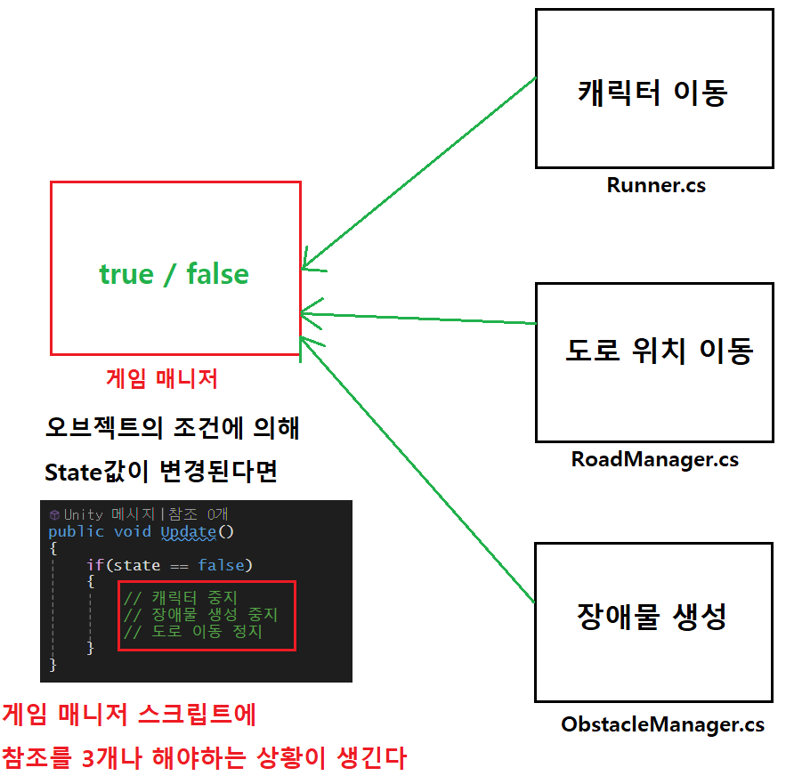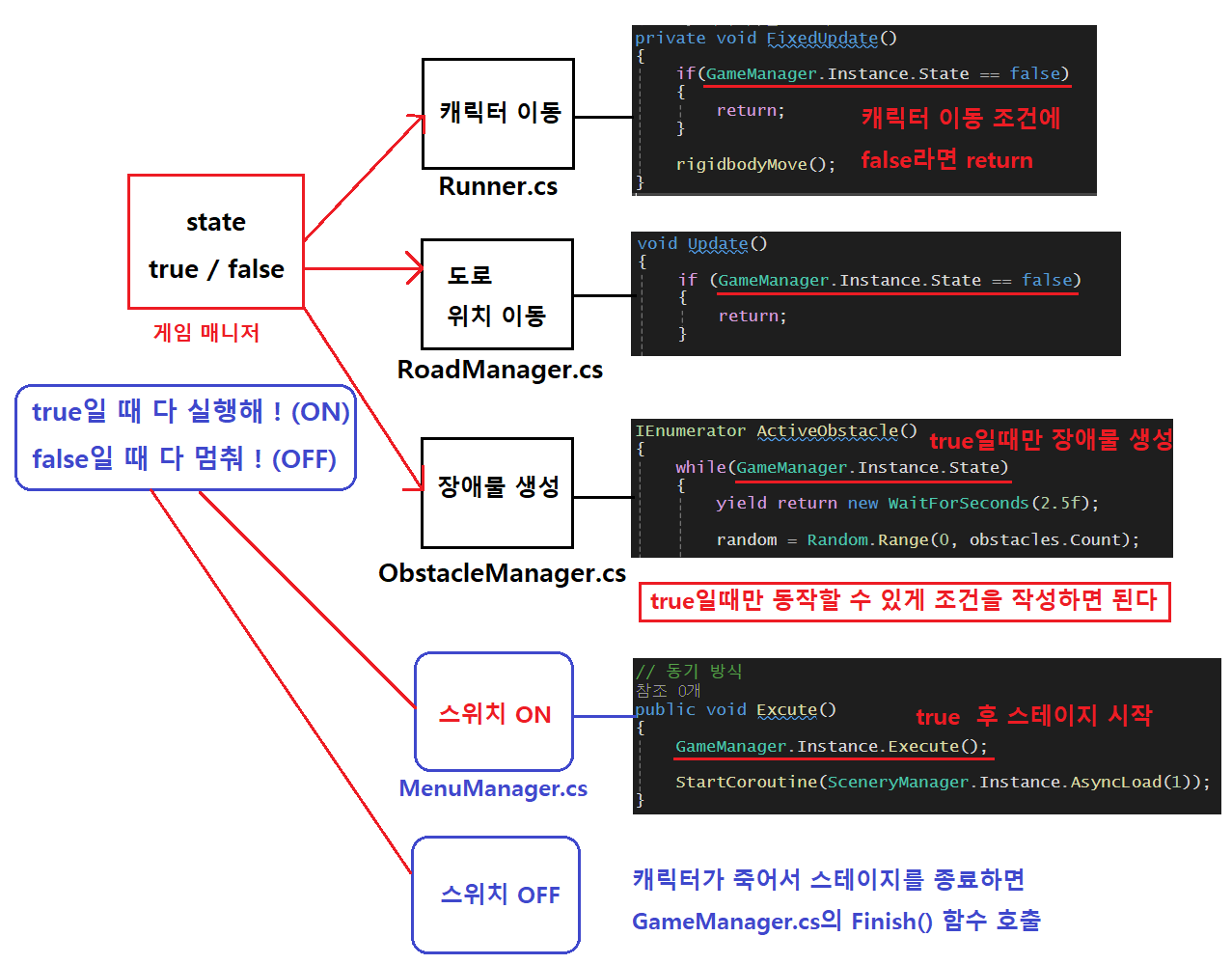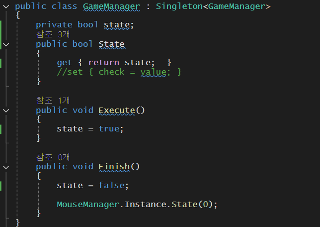 위 코드에서는 싱글톤 게임 매니저를 다른 스크립트에서 조건을 작성하고, 함수도 스위치 역할로만 호출된다