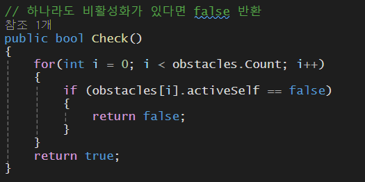 ObstacleManager check() 함수리스트 크기만큼 반복하여 들어있는 요소들 중 하나라도 비활성화 상태라면 false를 반환한다