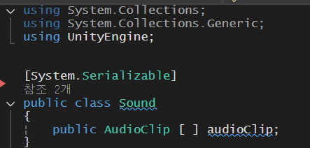 Sound 정의하기Monobehaviour를 상속받지 않는 Sound 클래스를 생성한다
