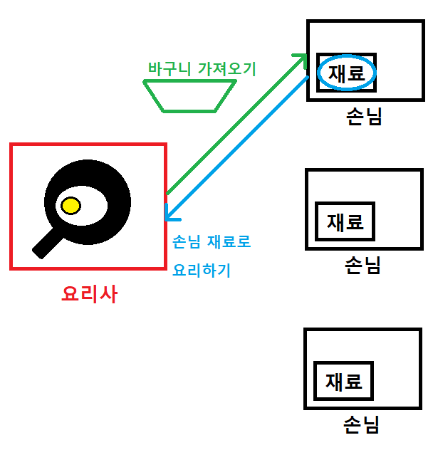 요리사는 손님의 재료를 담을 바구니를 가지고 있다.