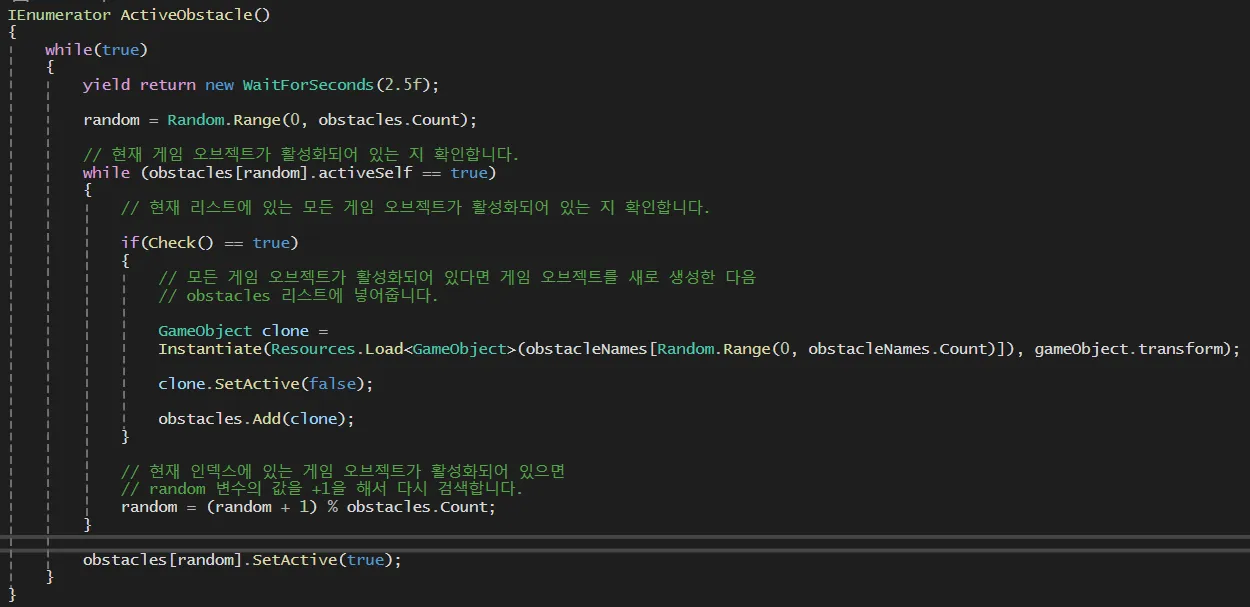 - 장애물 오브젝트가 리스트에 5개 들어있고 모두 활성화 되어있을 경우, 추가적인 장애물을 생성되게 하기