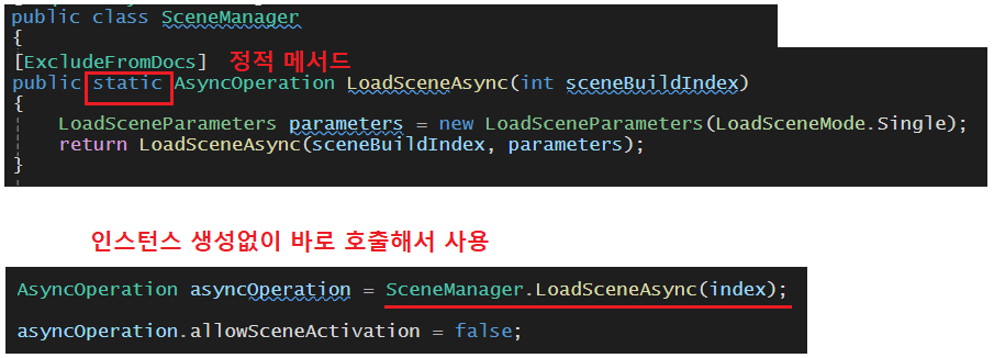SceneManager 자체는 정적클래스가 아니지만 LoadSceneAsync 함수는 정적 메서드이다