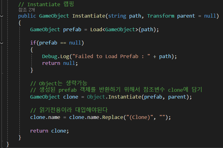 Load<T> 에서 반환된 게임 오브젝트를 prefab 참조변수로 참조한다