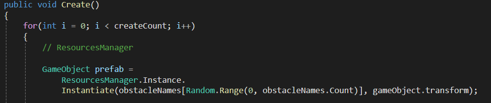 Resources폴더에서 가져와서 동적 생성하는데, 이 방법 대신에Resources폴더에서 가져와서 생성을 담당하는ResourcesManager만들기- 캐릭터가 장애물에 닿으면