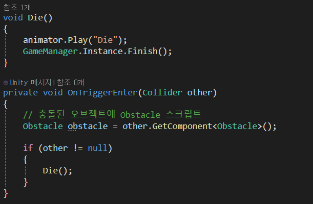 Runner 스크립트)충돌한 other 에 Obstacle 컴포넌트가 없다면