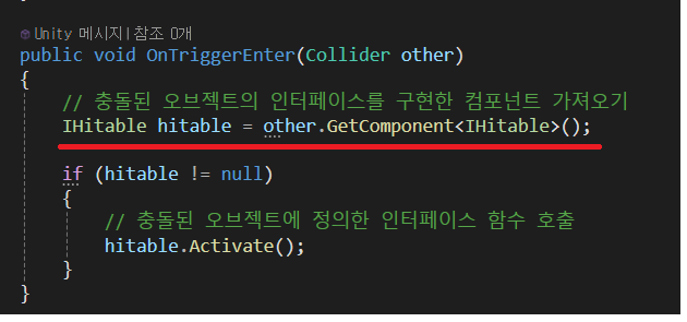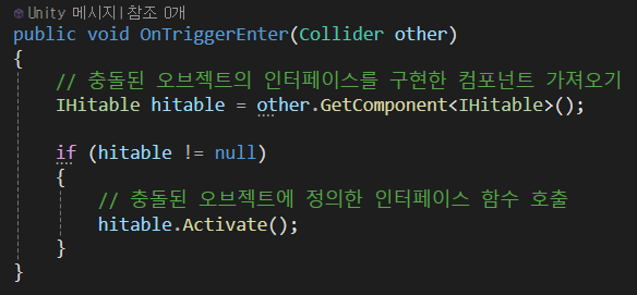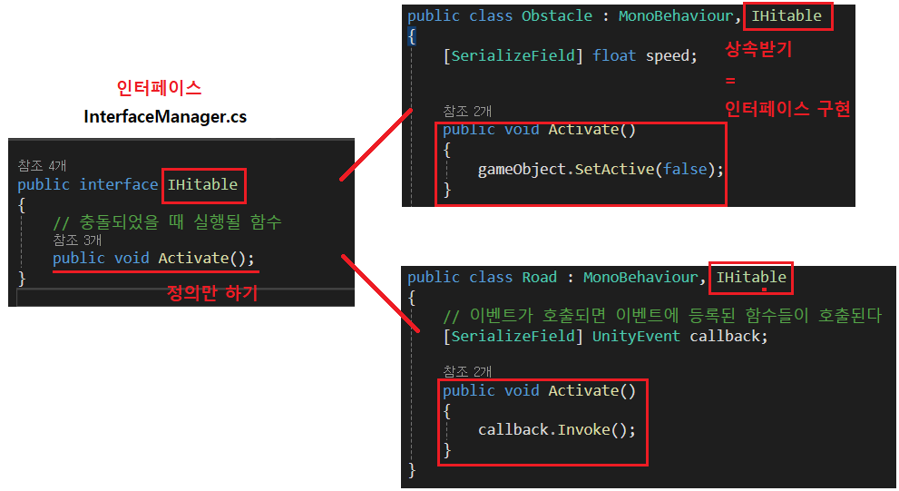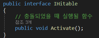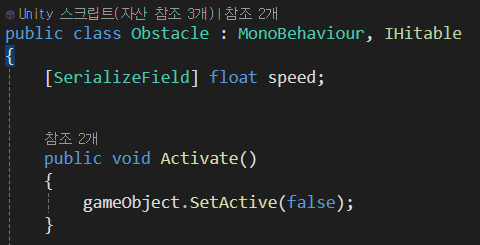 예를 들면, Obstacle 스크립트가 인터페이스 IHitable을 상속받고 Activate()함수에 게임 오브젝트 비활성화 로직을 정의해두었다면