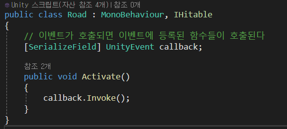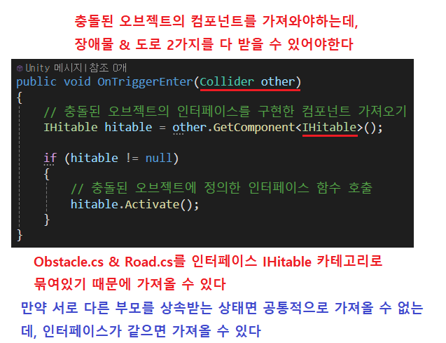 Obstacle 스크립트와 Road 스크립트는 IHitable 인터페이스를 상속받는다
