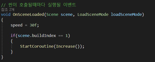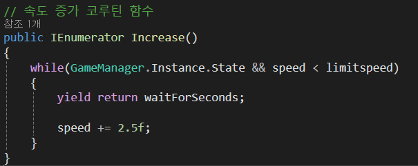 -> 스테이지가 시작되고 5초뒤에 스피드값이 증가되야 하기 때문에 yield return 이후에 스피드 증가