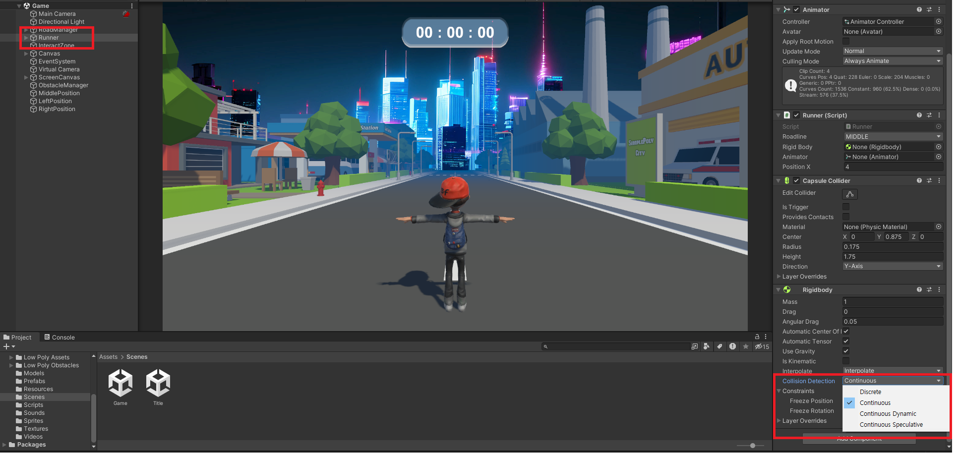 Collision Detection)리지드 바디 컴포넌트의 Collision Detection 프로퍼티(연속 충돌 검사)를 조정한다