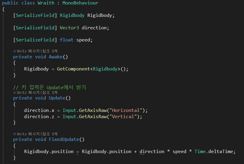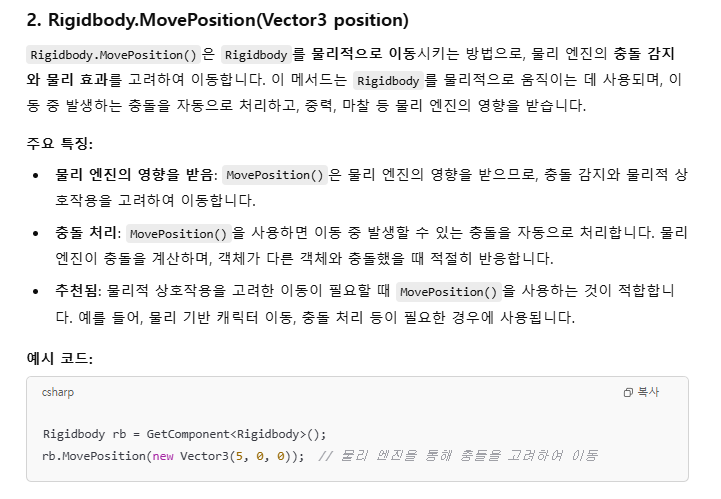 Rigidbody를 사용한 이동과 transform을 사용한 이동의 차이점Rigidbody : 물리 기반의 움직임을 구현할 때 사용된다. 물리적인 힘, 충력, 충돌 효과로 객체가 이동하게 됨 - Rigidbody 컴포넌트가 연결된 게임 오브젝트의 위치를 나타내는 Vector3의 값
