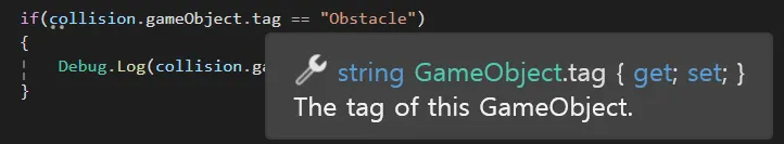 CompareTag게임 오브젝트를 분류하고 식별하는 데 사용되는 문자열