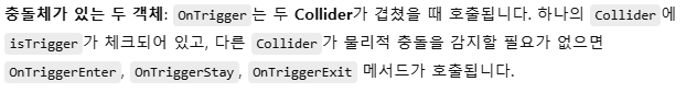 → isTrigger가 체크되어있는 오브젝트의 콜라이더와 충돌했는지를 감지 (물리적 충돌x)