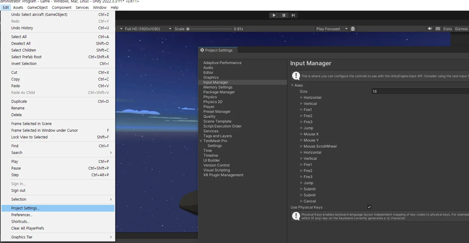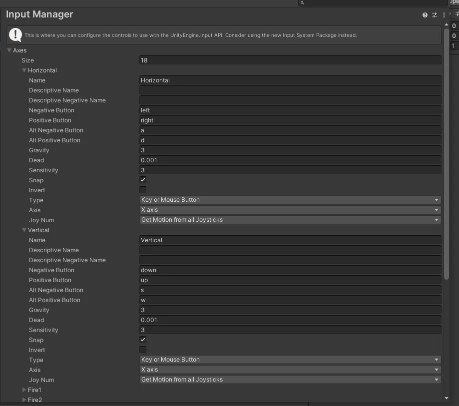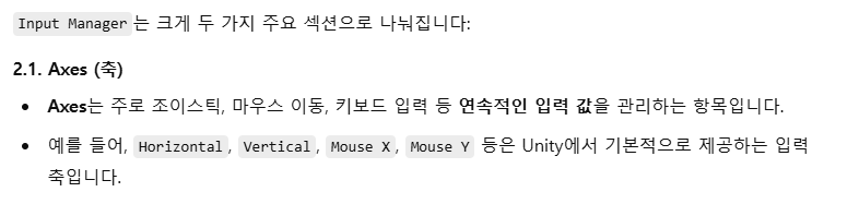 Input Manager 를 살펴보면 Horizontal과 Vertical이 유니티 내에서 수치가 미리 지정이 되어있다