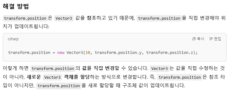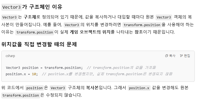 Vector3가 구조체이기 때문에 Vector3의 값을 직접 수정하려면 transform.position과 같은 참조를 통해 접근하여야 한다는 의미
