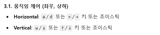 GetAxisRaw : 값이 -1, 0, 1로만 반환된다. 부드러운 변화가 아닌 값이 즉각적으로 변한다