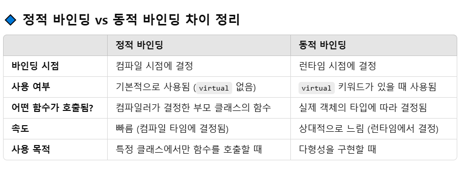 "virtual을 선언하면, 실행 중(런타임)에 실제 객체를 확인해서 함수를 호출한다!" 🚀