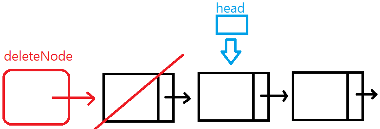 head의 위치를 deleteNode의 next로 이동시키고 deleteNode가 가리키는 곳 delete
