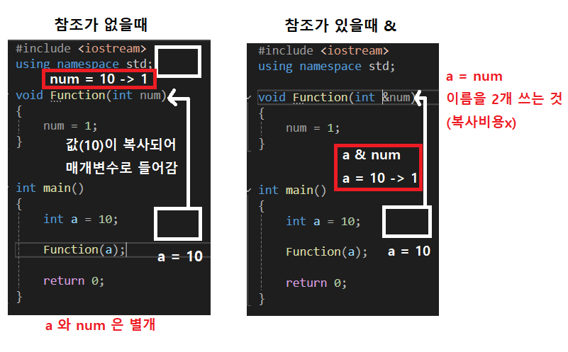 변수 a가 복사되어 매개변수로 들어가지 않고, 본래 그대로 매개변수로 들어간다