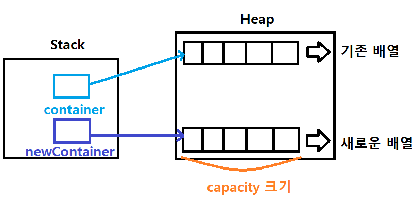 주로 capacity값을 2배로 할당해준 뒤 기존의 배열 데이터의 값을 새 배열로 복사하여주고 기존의 배열은 해제한다