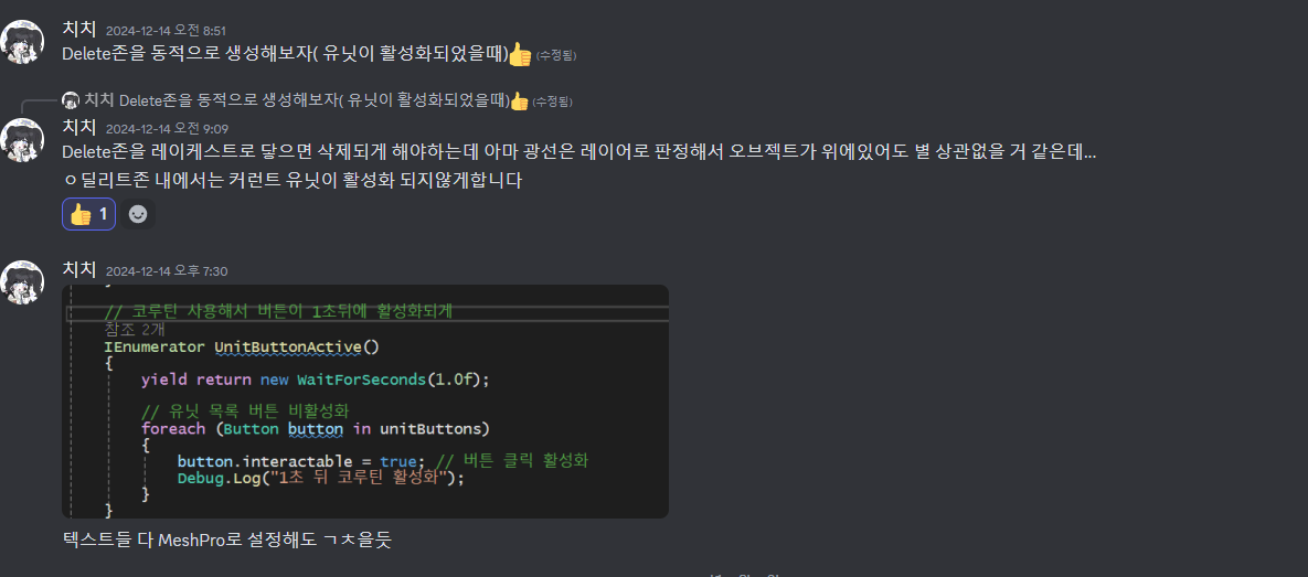 삭제된 후, 유닛 목록 버튼은 coroutine을 사용하여 1초뒤에 상호작용이 활성화 되게 하였다
