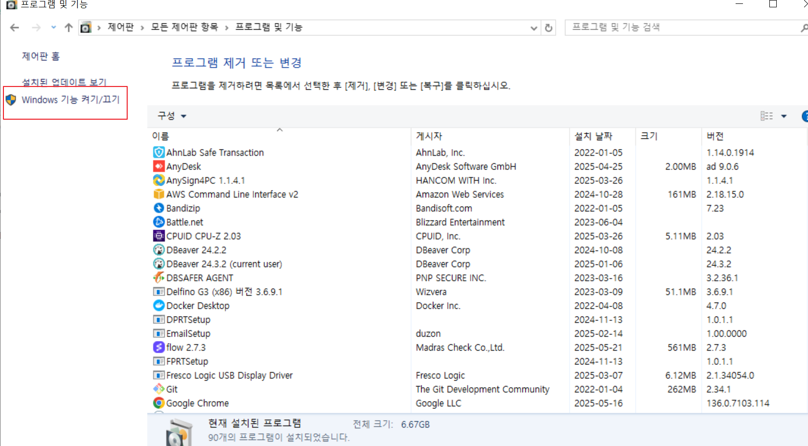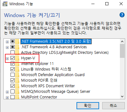 제어판> 프로그램 및 기능 > Windows 기능 켜기 / 끄기 클릭 Hyper-V 체크 > 확인 후 컴퓨터 리부팅
