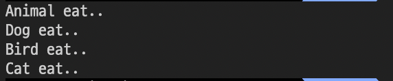 이렇게 부모 클래스에서 구현한 메서드를 자식 클래스에서 다른 동작을 하도록 다시 만드는 것을 오버라이딩이라고 한다. 또한, 이렇게 런타임에 결정되는 다형성을 동적 다형성이라고 한다.